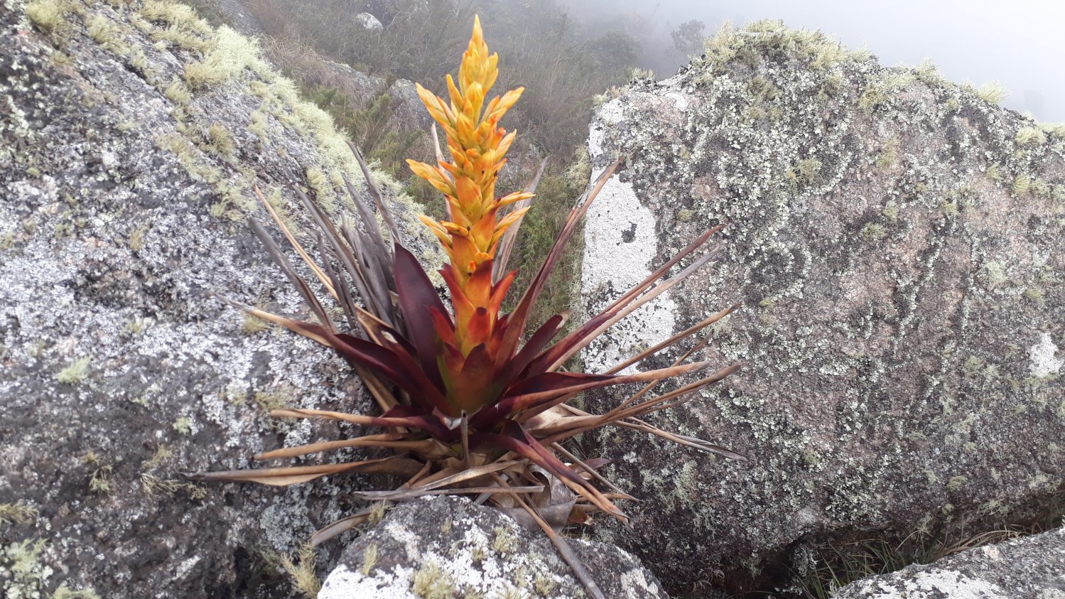 No declive de terreno que antecede a subida ao pico existem muitos líquens e bromélias interessantes. Esta aqui era gigante (cerca de 2m) e estava no momento raro da floração que antecede a morte para o nascimento de outras.
