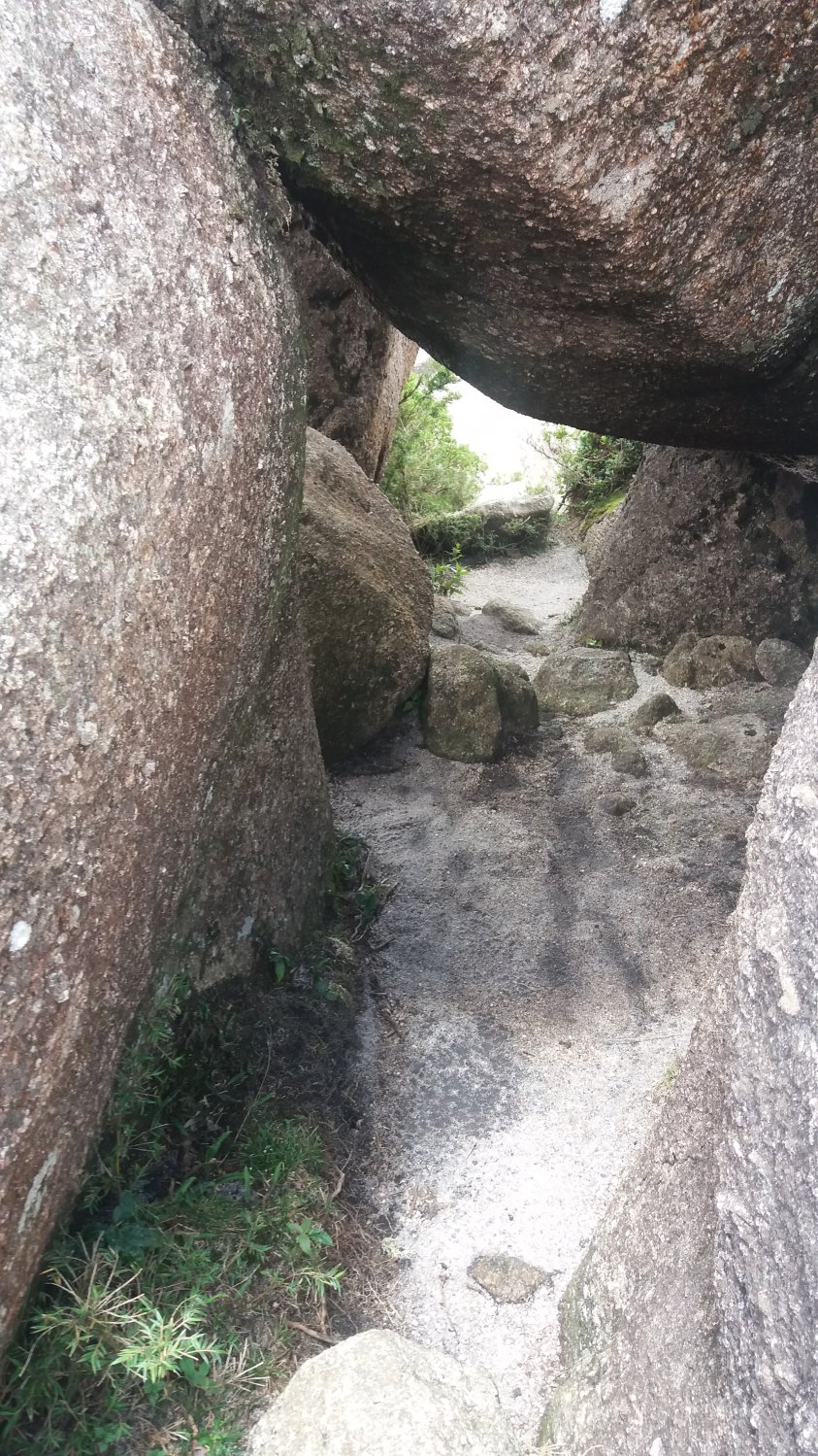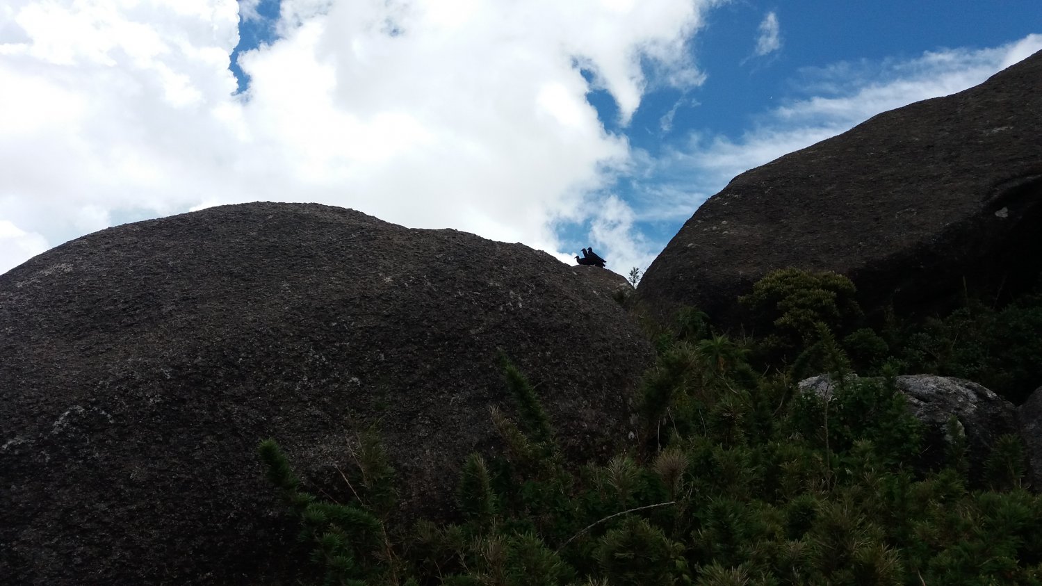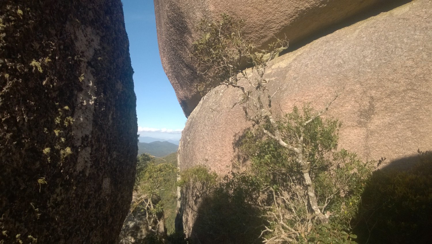 Prosseguindo daí por cerca de 2,3km a trilha bifurca: é possível seguir direto para o pico do Marinzinho ou tomar a esquerda pela mata (tem duas placas, onde se lê Pedra Montada e h2o). Seguindo a trilha à esquerda, em 300m chega-se na Pedra Montada que é um grande bolder redondo rachado em dois que se não me engano ainda não foi escalado. Essa trilha passa no último ponto de água, e recomendo que se leve pelo menos 1,5 litro por pessoa para subir o Marinzinho, porque depois não existe mais água. Não acredite nos que dizem que tem água no pico, eu subi várias vezes e nunca vi, só se for em alguma grota escondida.