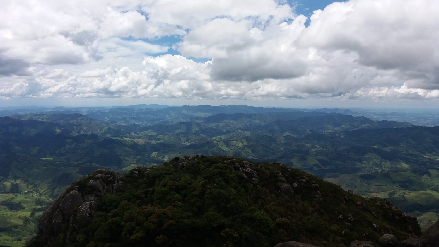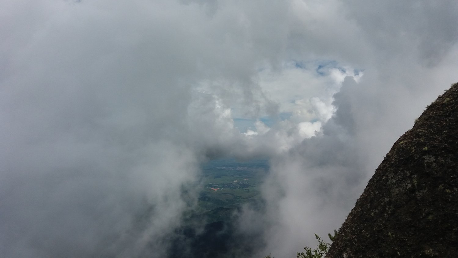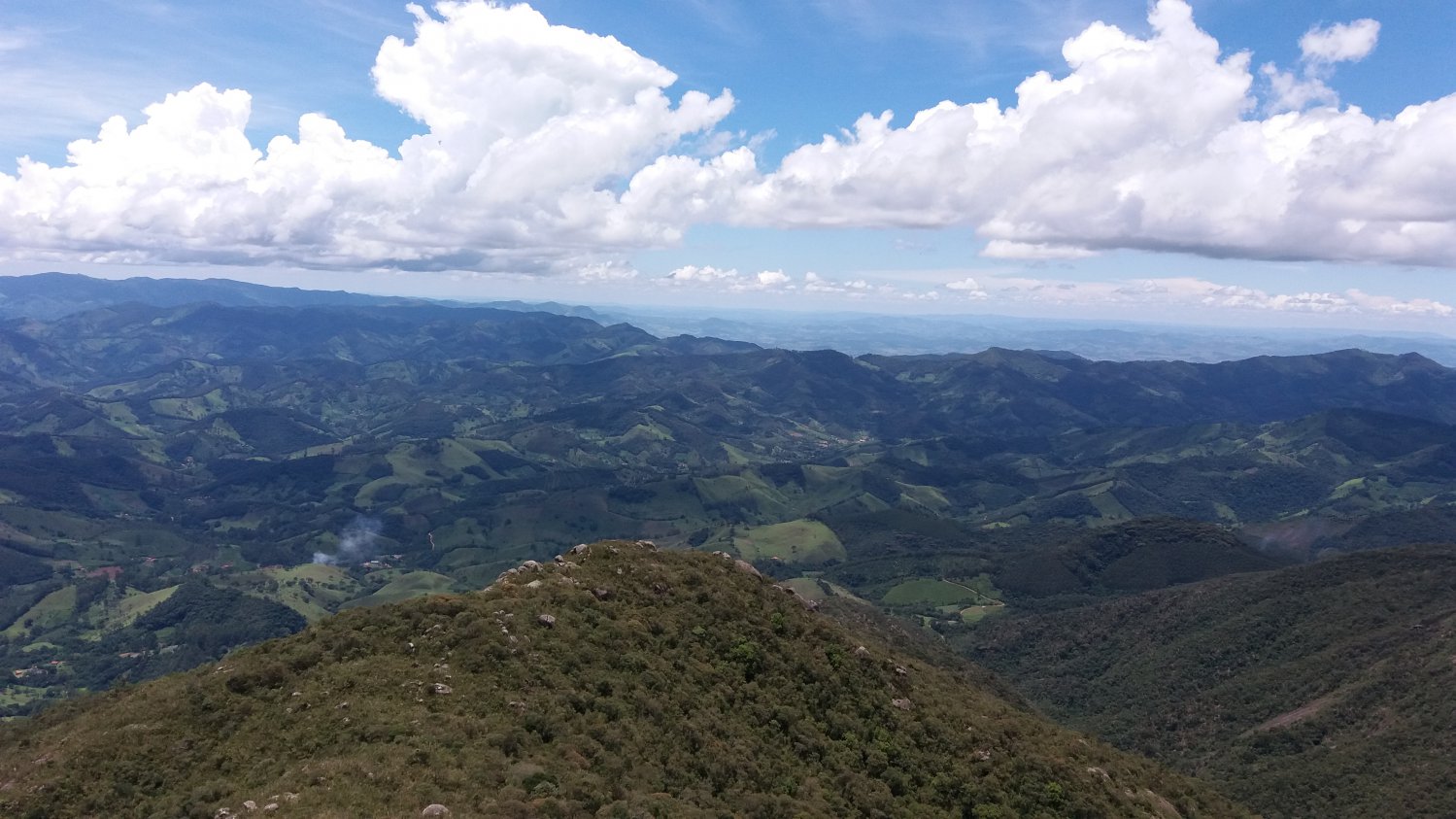 Acima o sul de Minas, e abaixo a crista de serra por onde passa a trilha do Itaguaré, com a Pedra Redonda bem no meio do caminho.