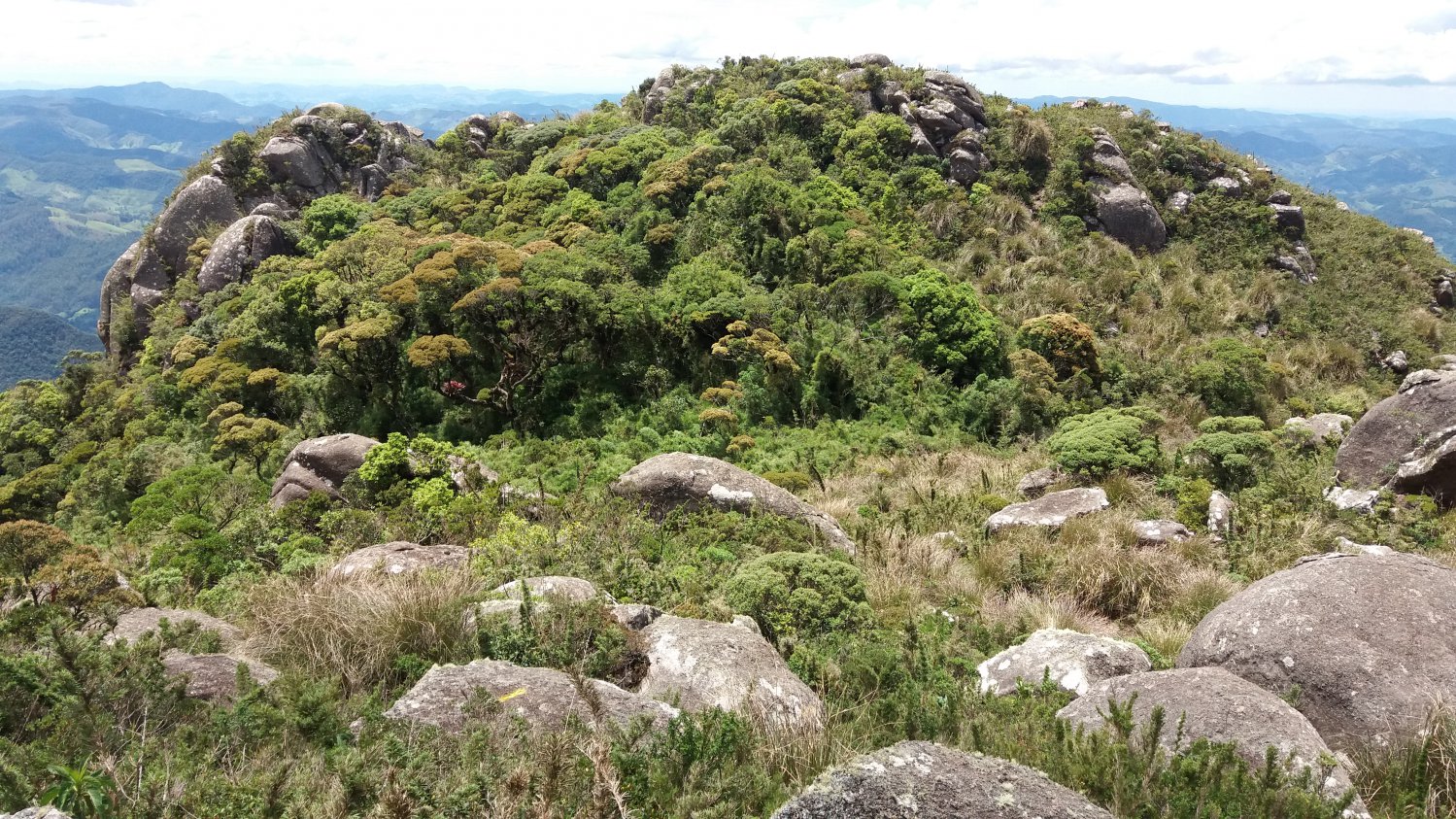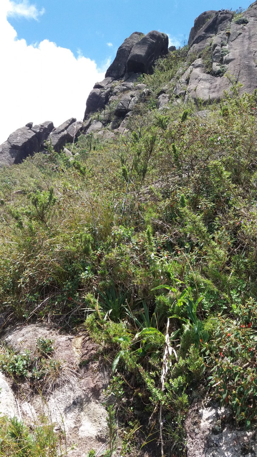 Nesse ponto chega-se a uma elevação que desce para um pequeno platô com capim elefante e uma mata de arbustos e árvores nanicas. Esse lugar tem uma vegetação muito interessante de líquens, flores, bromélias e orquídeas. Para quem gosta de botânica, a região do Marins é bem interessante e rica. Vá em setembro para ver a floração das açucenas. Dessa vez não fotografei ali, mas em breve vou postar outras trilhas que fiz pasando por ali e incluirei as fotos de plantas.