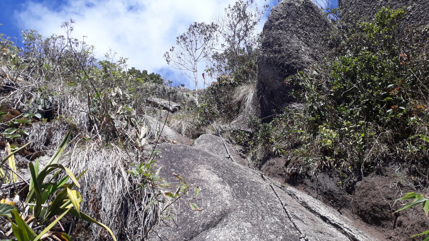 A trilha segue pela mata, subindo sempre. Num certo ponto a mata acaba e você chega na área das rochas. Nessa etapa começam a aparecer umas passagens que exigem uma certa técnica, pontos nos quais é preciso escalaminhar, e existem algumas cordas nas passagens mais verticais, que são mantidas pelo sr. Maeda. Eu recomendo que não se confie jamais nessas cordas, porque ficam expostas ao tempo e são amarradas (!) nas rochas e tocos, contrariando princípios básicos de elaboração desse tipo de via permanente (vias ferratas, como o nome indica, tem que ser metálicas e chumbadas).