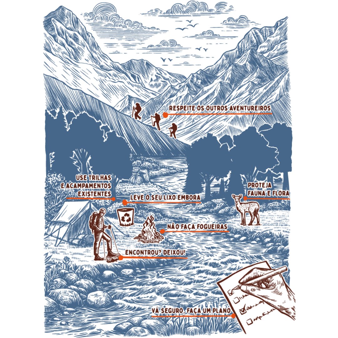 A camiseta Não Deixe Rastros é um símbolo de valores que inspira todos ao seu redor para praticar o Mínimo Impacto Na Natureza.