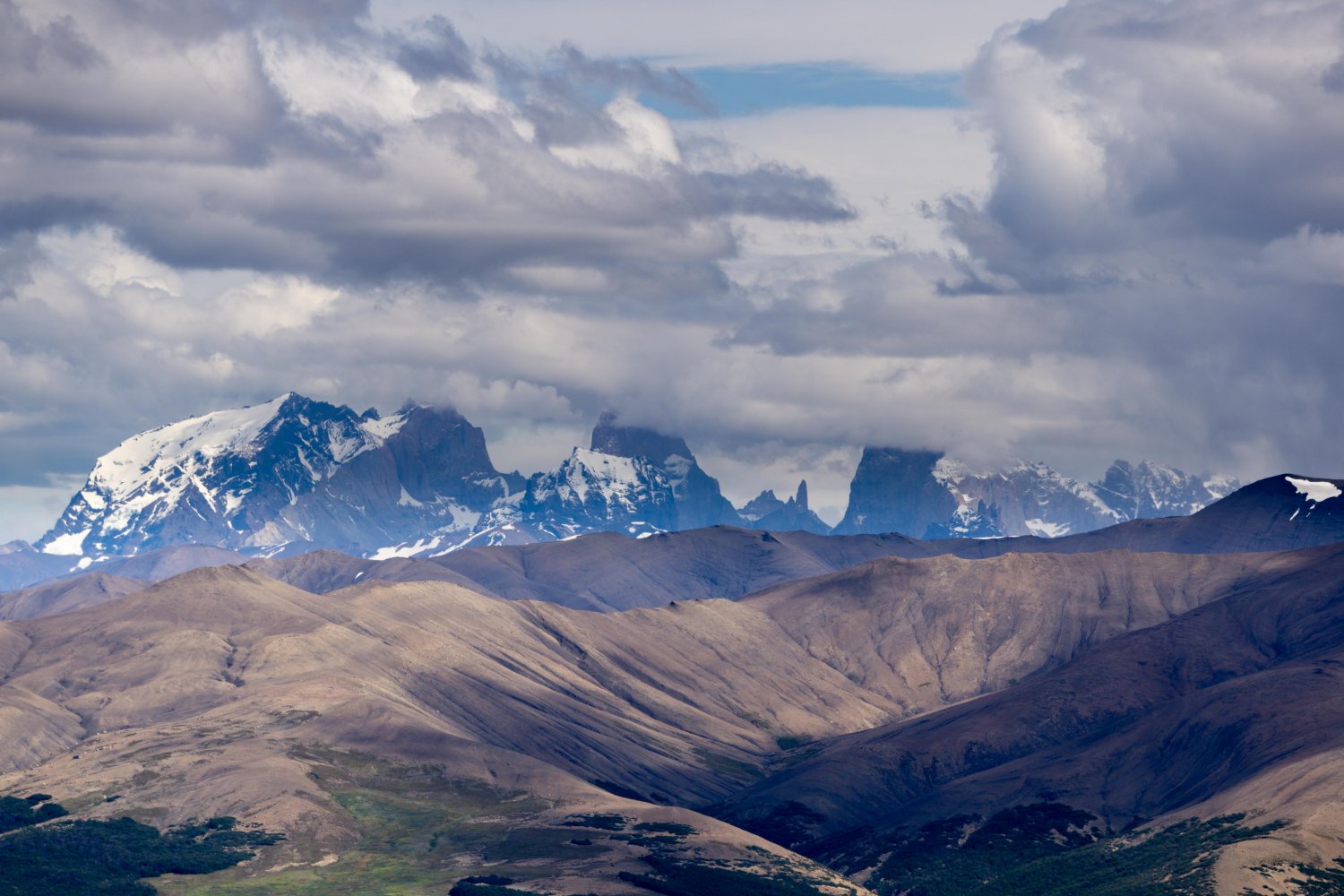Torres del Paine no centro um pouco à direita na foto, abaixo das nuvens