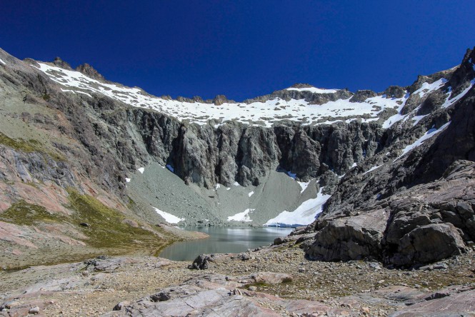 Subimos margeando o riacho Casa de Piedra até a laguna Jakob (foto).