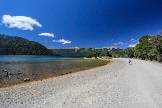 Conhecemos o lago Los Moscos e seguimos pela estrada que margea o lago Mascardi (foto), até o camping La Querencia, onde acampamos.