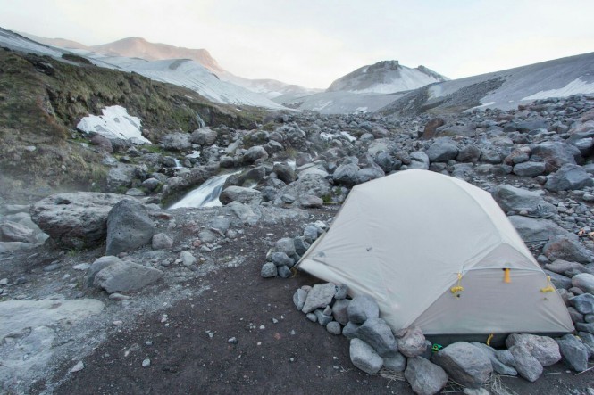 Após 5h30min de caminhada, montamos a barraca com o rio com água quente ao lado, e algumas quedas d'água.