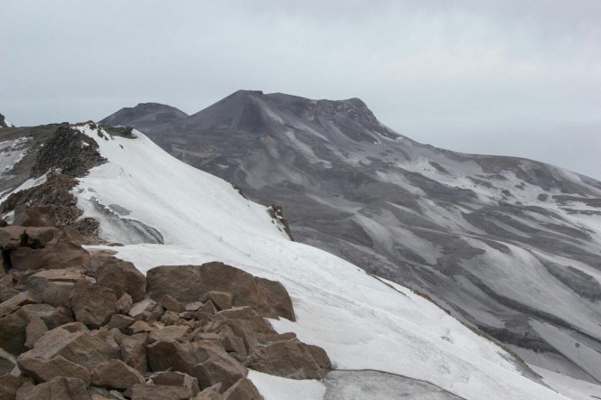 Foi uma subida dura. Em outubro ainda havia muita neve. Na maior parte, a neve estava razoavelmente firme para caminhar, mas sempre tinha uma pisada onde afundávamos até a cintura. Para o Ramon, mais pesado que eu, foram várias pisadas até o joelho, que o deixou bem cansado. O ideal seria andar com ski ou com raquetas.