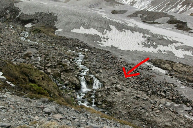 Na foto abaixo, a seta indica o local que montamos nosso acampamento. Naquele momento não tínhamos a certeza se escolhemos o melhor lugar. Mas o frio intenso, junto com algumas rajadas de vento, nos ajudaram a decidir a ficar por lá mesmo, no primeiro lugar bacana que encontramos.