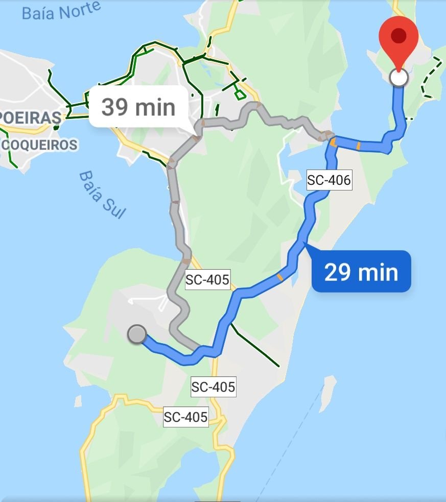 A foto abaixo mostra o trecho que eu fiz do aeroporto de Florianópolis ao camping da Barra, foram 21 km de pedal tranquilo, entretanto a subida do morro da praia mole foi extremamente cansativo eu tive que empurrar a bicicleta por todo trecho.