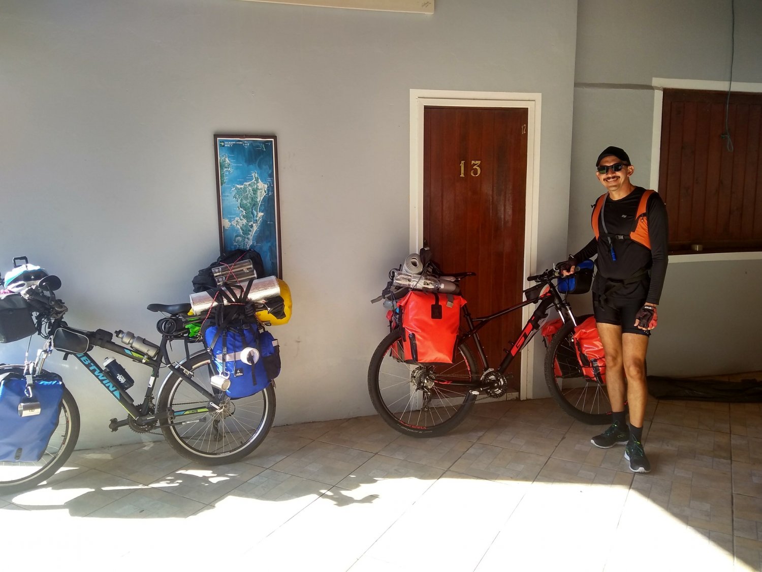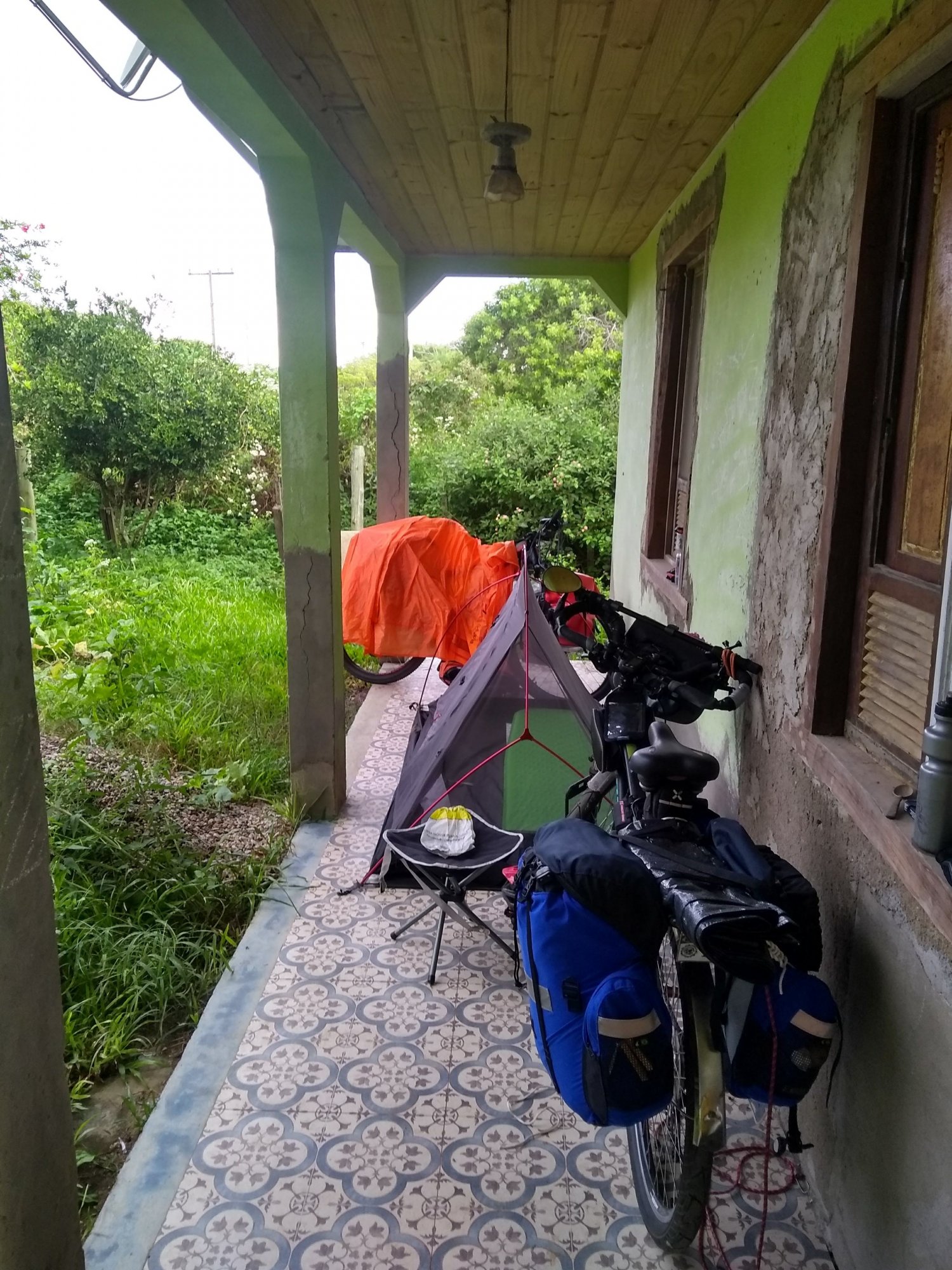 Seguimos então para o sul do Rio Grande do sul onde passamos a noite na cidade de bojuru em um warmshower. Eu cheguei na casa do seu Luiz por volta das 6 horas da tarde. O parça tinha ficado para trás e com o passar do tempo comecei a me preocupar com ele pois deu 7, 8, 9 horas da noite ele não chegava. Eu tenho um certo transtorno de ansiedade, então, pensar negativamente faz parte do meu dia a dia, muitas coisas poderiam ter acontecido com ele, pneu furado, assalto, acidente, quebra da bicicleta, mas finalmente ele chegou e depois de tomarmos banho fomos convidados para jantar. Nós arrumamos a nossas barracas do lado de fora da casa, mas era um local tranquilo e confortável e no dia seguinte nós seguiremos para Rio Grande.