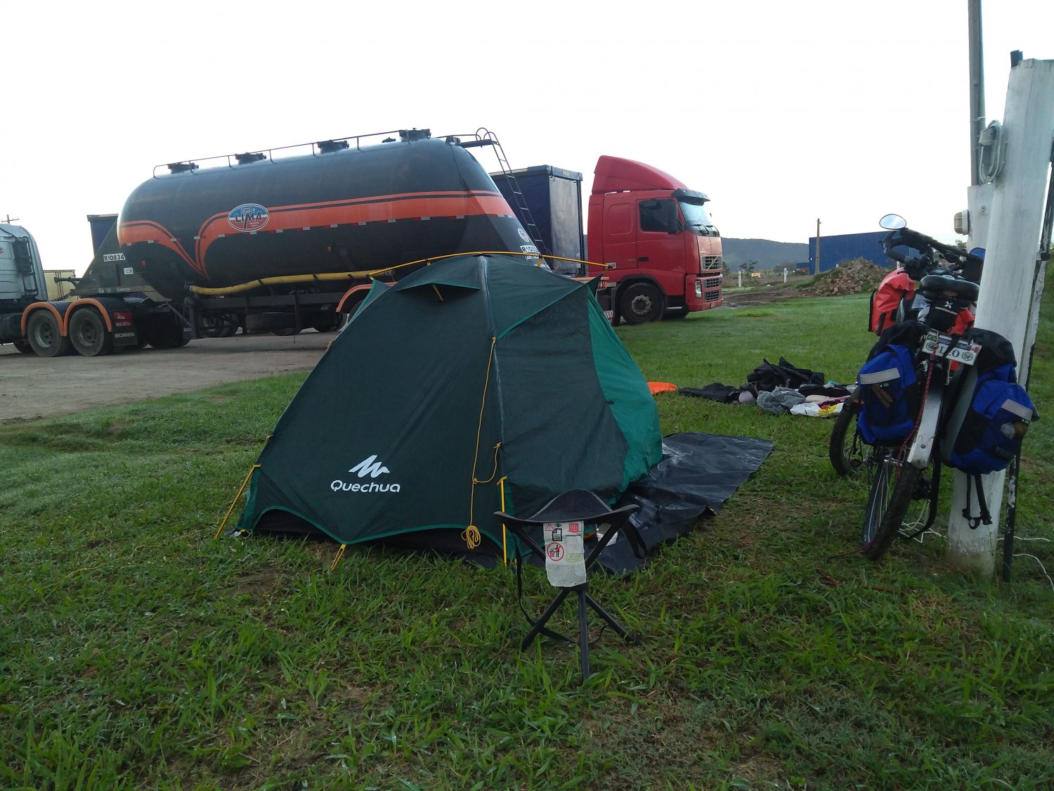 Por volta de 4 horas da tarde pedimos permissão para montarmos a barraca em um posto de gasolina as margens da br-101. A noite não foi muito tranquila, pois o local onde montamos barraca era uma estacionamento de caminhão. Passamos a noite inteira acordando com medo que os caminhões fossem passar por cima das barraca...(risos).
