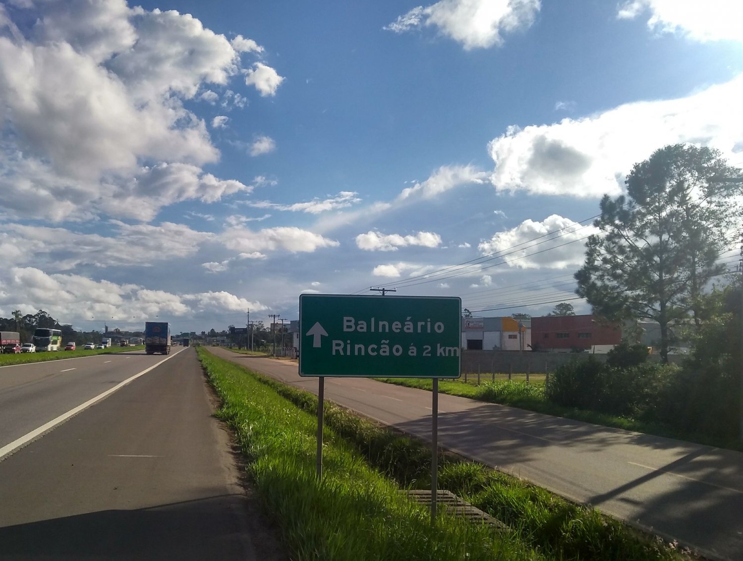 Depois de conversar um pouco com os donos da casa e tomar café, nós arrumamos as nossas coisas e seguimos para balneário Rincão. A distância de onde estávamos até balneário Rincão era de mais ou menos 65 Km. Durante toda a viagem nós não tivemos nenhum perrengue na br-101. O trecho sempre muito tranquilo, entretanto nós tínhamos muito cuidado com os caminhões e carros que passavam em alta velocidade ao nosso lado. O vácuo causado pelo caminhão poderia nos derrubar da bicicleta.