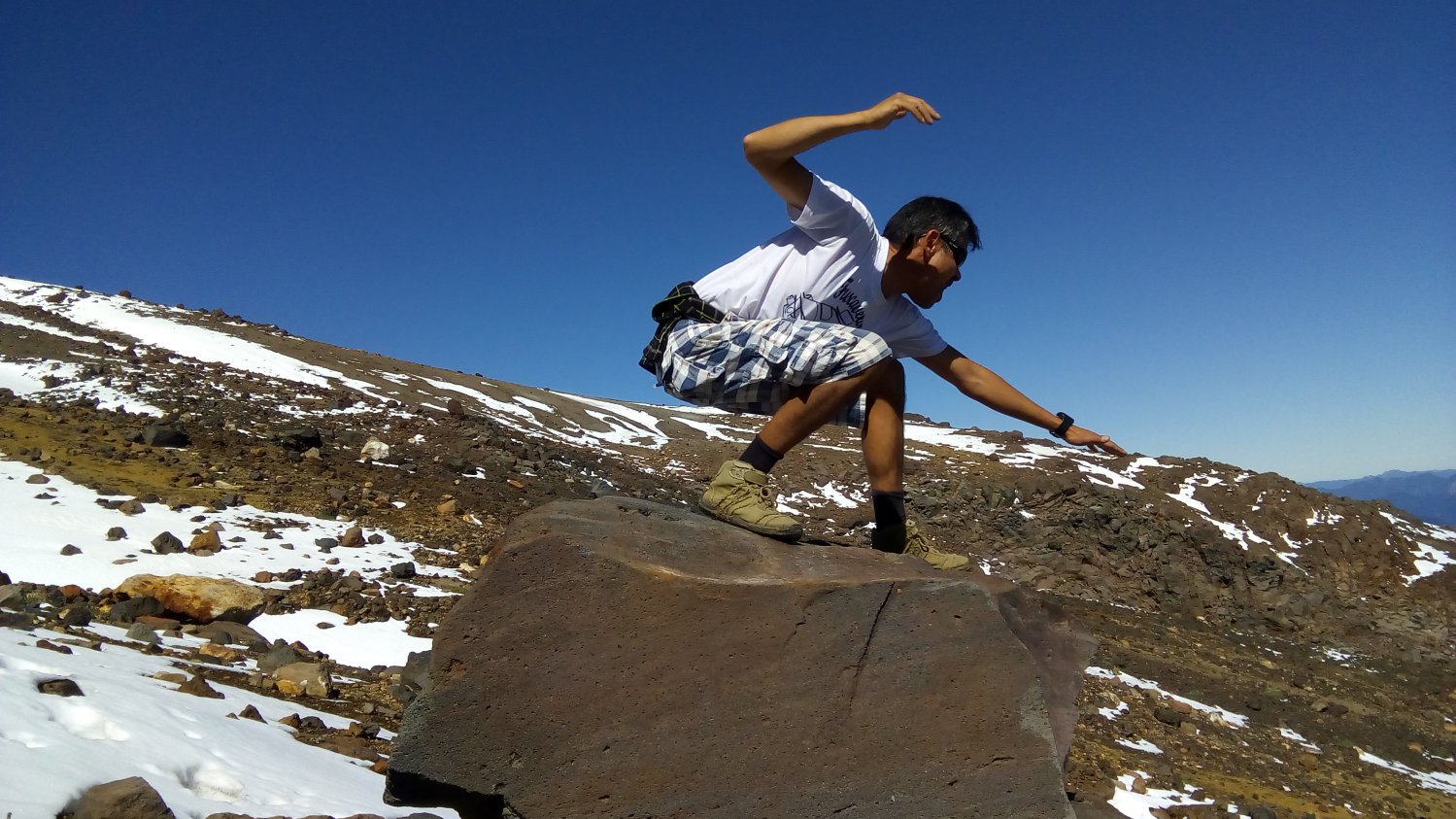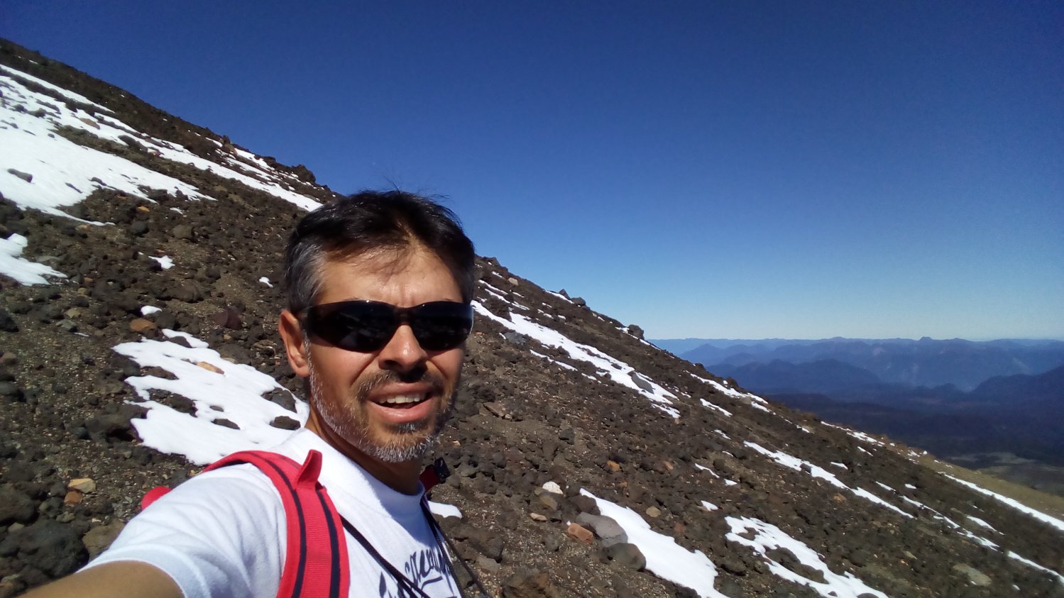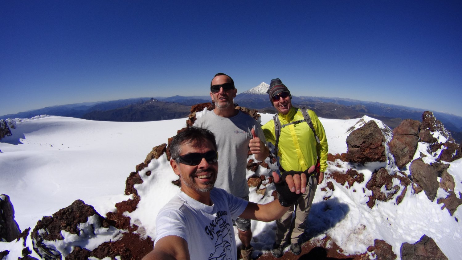 Finalmente após 2h20min de caminhada (são atletas de montanha), intercalada com paradas de 1h20min (3h40min ao todo, para caminhantes normais eu acrescentaria mais 1h de tempo), nosso trio chegou à maravilhosa cratera do vulcão Quetrupillán, com diâmetro médio de 1Km, coberto de neve que protege uma geleira imensa em sua caldeira vulcânica.