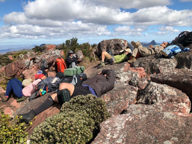 Galera descansando. A pedra atrás de mim (de verde) é o ponto mais alto do Barbado.