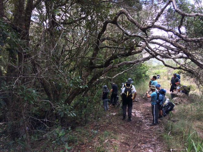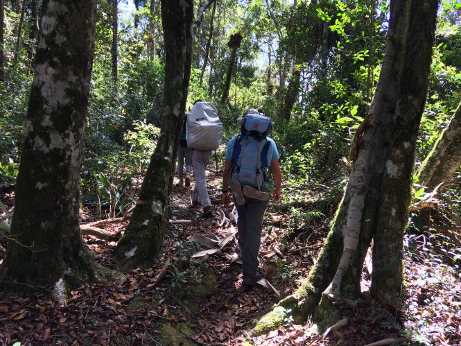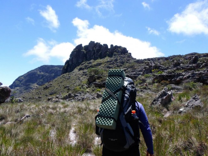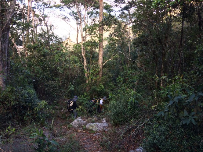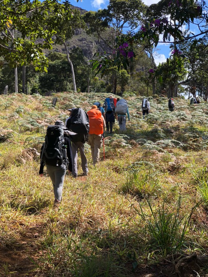 Mochila nas costas, começamos a subir, seguindo a trilha em sentido contrário ao de ontem. O ponto para subir o Barbado havia ficado para trás no dia anterior. Ontem avançamos para nosso local de acampada porque era o melhor ponto (cachoeira e um visual incrível).