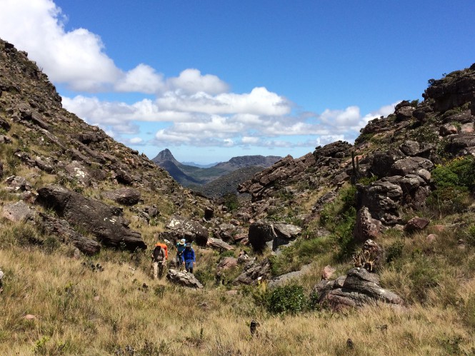 A van nos levou de Piatã para Catolés onde saltamos na caixa d'água do vilarejo, o ponto mais alto onde o veículo podia chegar, e botamos o pé na trilha. Nosso objetivo era subir para o vale do Guarda Mor onde começava um vale lateral, da Mata dos Frios.