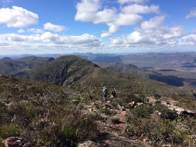 Vista desimpedida, céu claro. O Pico das Almas e o Itobira (2ª e 3ª montanhas mais altas do NE) nos quadrantes Sudeste e Sul, respectivamente. A Leste a Serra da Tromba e mais atrás desta os Gerais de Mucugê e a Serra do Sincorá (Parque Nacional da Chapada Diamantina).