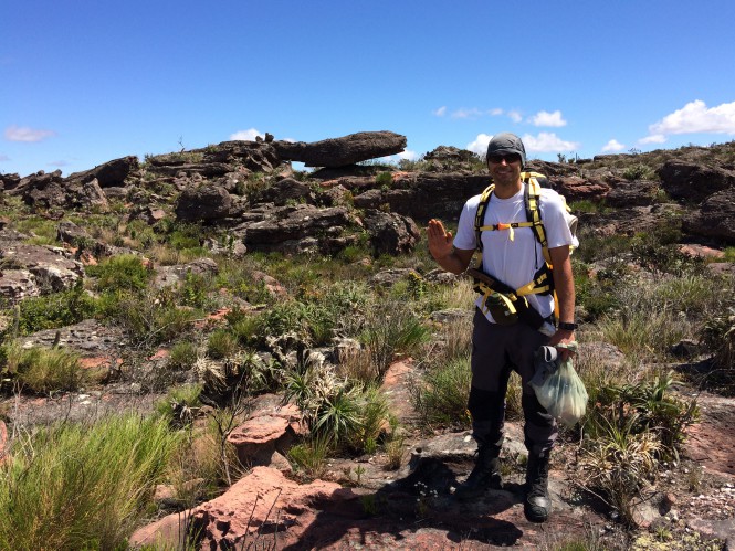 Júnior no platô. O cume do Barbado aparece a esquerda, bem trás da formação rochosa ao centro.