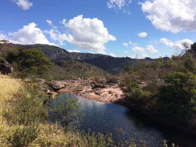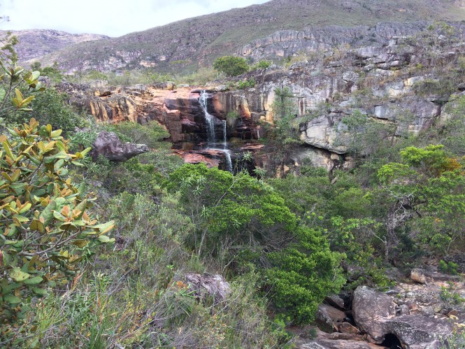 Após cerca de uma hora de caminhada chegamos na cachoeira do Guarda Mor, lugar bonito, mas sem muita água (estávamos no mês mais seco). Muitas fotos e um lanche a título de café da manhã.
