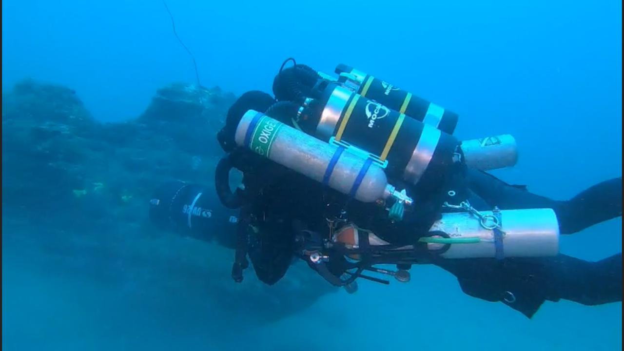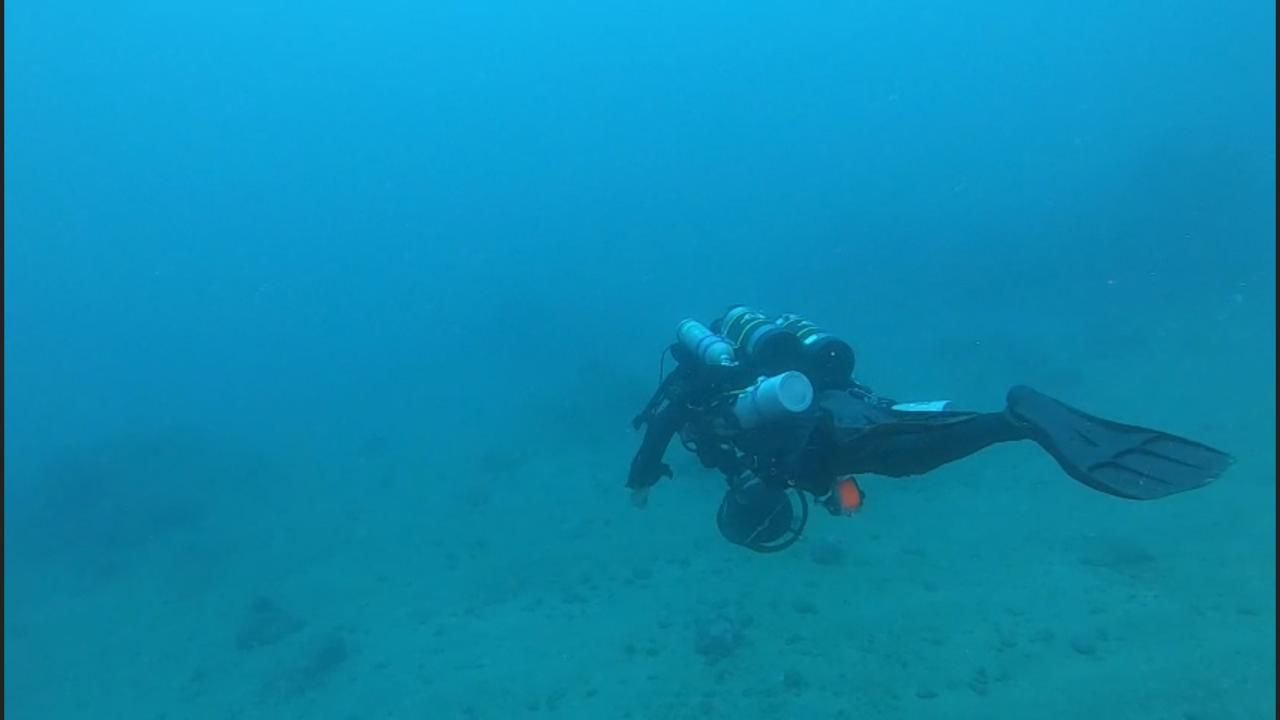 Anexo o vídeo mostrando o László e seu rebreather duplo e passeando com o DPV. Notar que em determinado momento do vídeo ele troca de um bocal para outro, ou seja, sai de um rebreather e vai para outro, o que faria numa situação de emergência se um deles falhasse. Ele que teve que fazer isto mais tarde devido ao vazamento no bocal do principal - ver vídeo extra.