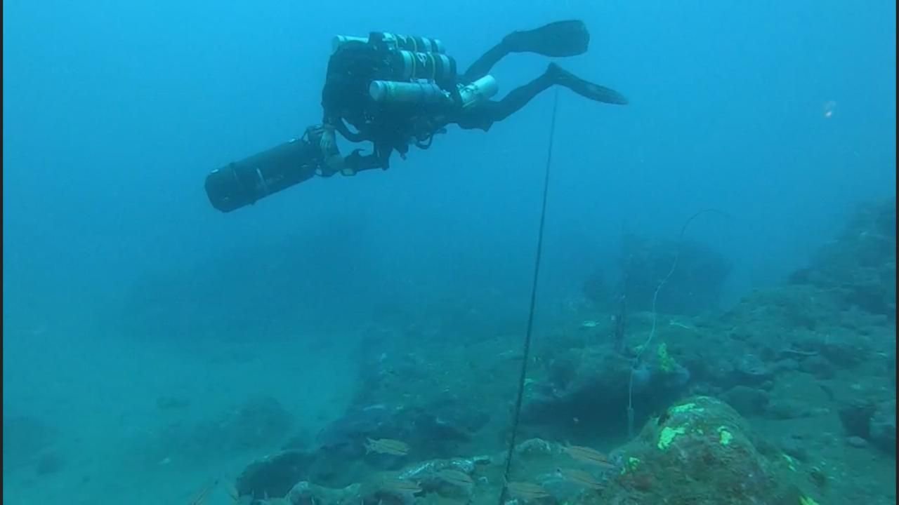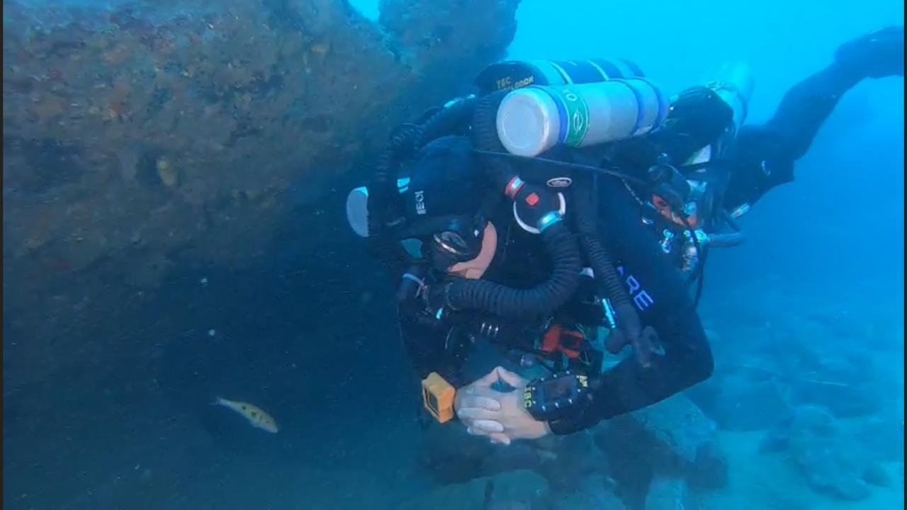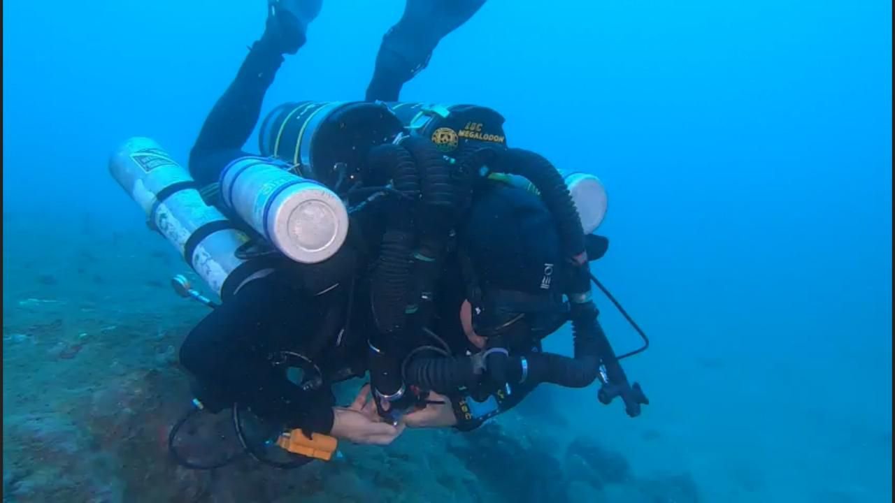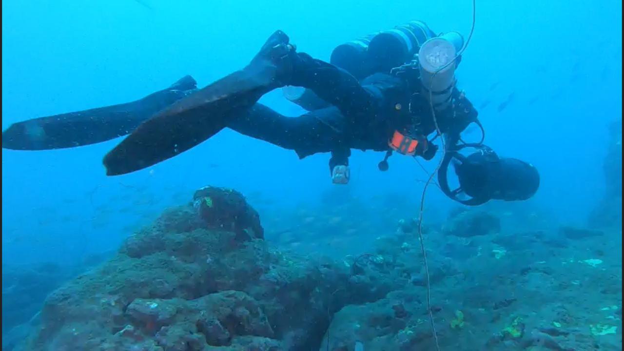 Mergulho na Pedra do Badejo, 45 metros, com László e Lusquinhos, testando equipamento novo e utilizando DPVs - Diver Propulsion Vehicles.