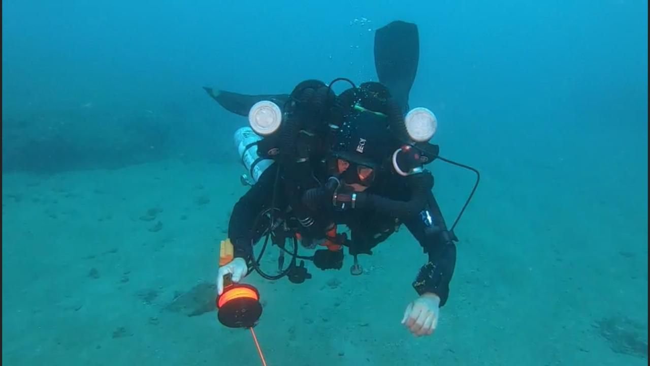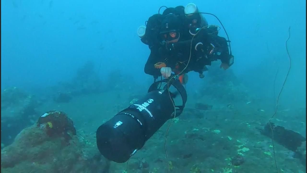 László segura a manopla que controla o DPV. Um cabo preso ao equipamento e ao corpo do mergulhador reboca o usuário.