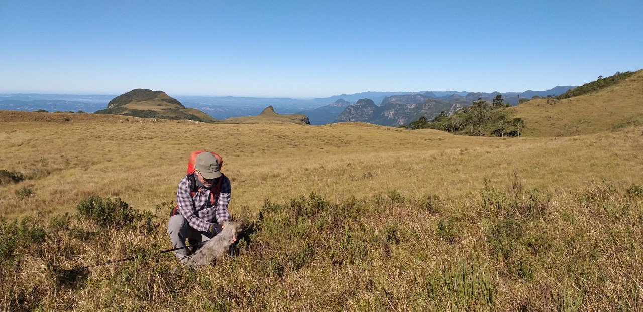 Apesar da subida cansativa o cachorrinho não arrefeceu. Chegamos no alto do morro, coberto por um campo de altitude.