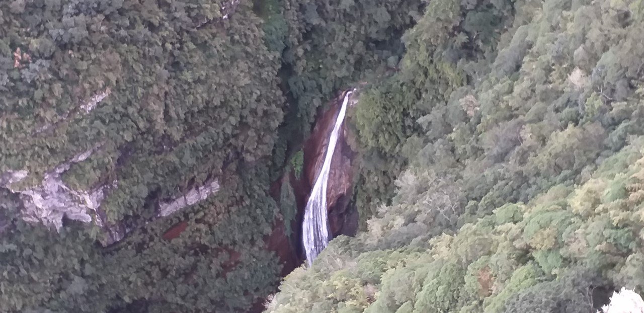 Dentro do cânion, beeem lá embaixo, uma bonita queda dágua. Mas zoom de celular é ruim!