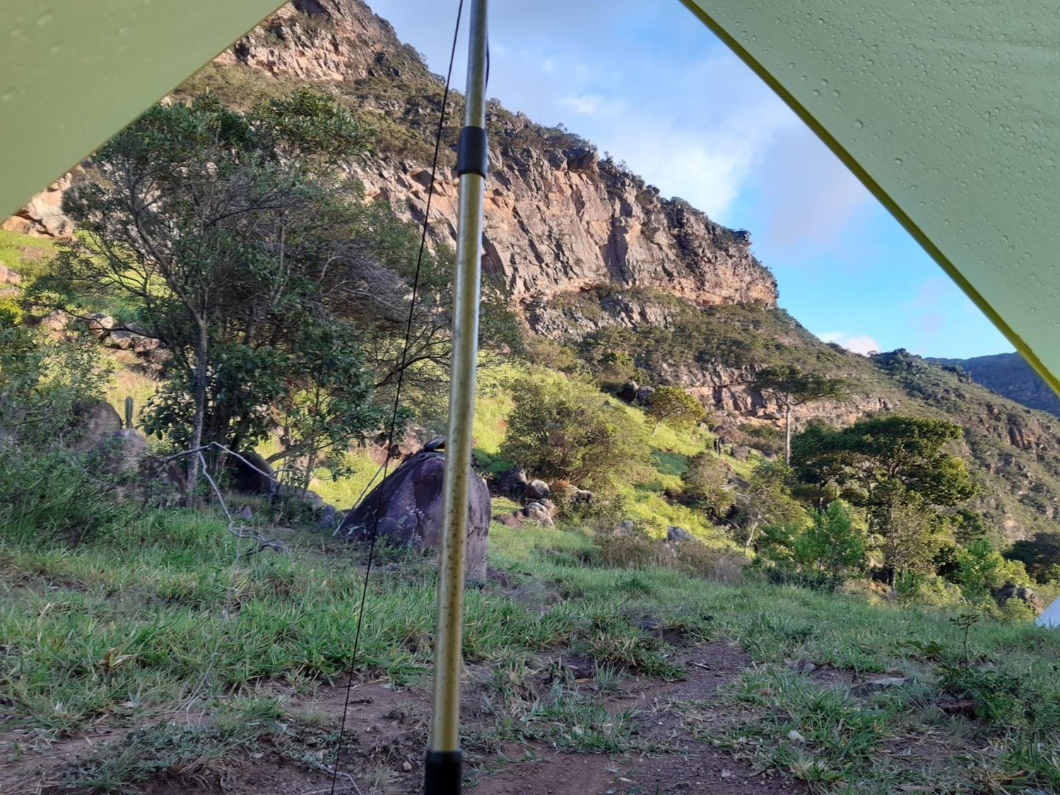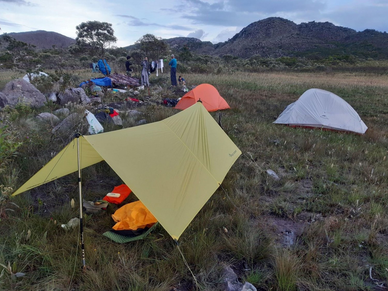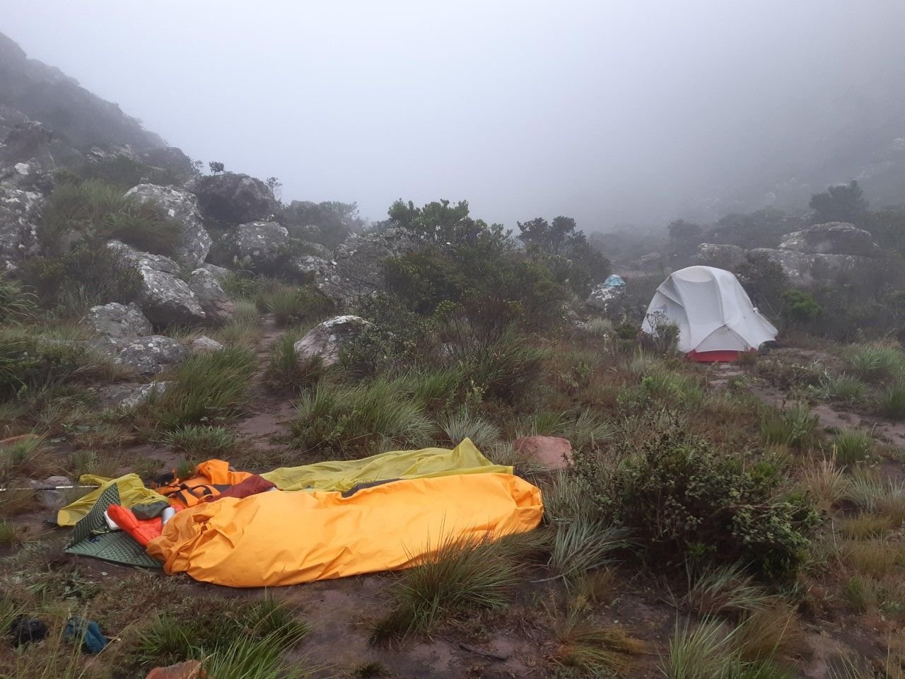 Armei numa péssima posição a minha tarp, erro de principiante. Durante a noite o vento canalizado na Forquilha (um colo estreito entre duas altas montanhas) aumentou assustadoramente. Já deitado fiquei com preguiça de levantar e reposicionar a tarp. Resultado, com o formato em “A”, um dos lados recebia em cheio as fortes rajadas de vendo e os espeques foram arrancados do chão. Botei pedras em cima. Porém o efeito de vela do tecido forçava muito o meu abrigo. O tecido formava uma barriga a cada rajada e eu recebia uma “barrigada”. Até que perdi a paciência e derrubei a tarp só ficando com o saco de bivaque como proteção. Consegui dormir. O saco de bivaque de e-Vent é muito eficiente.