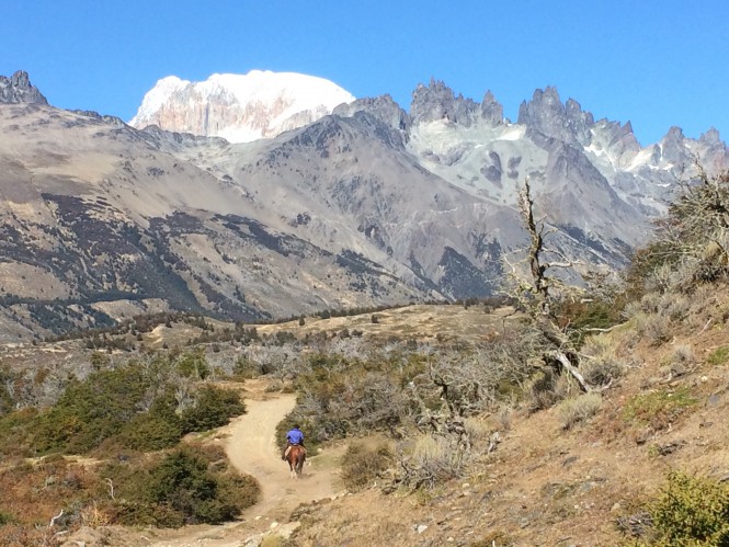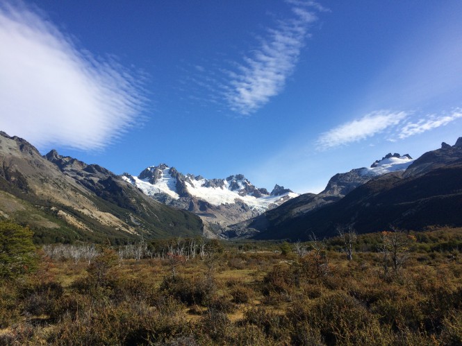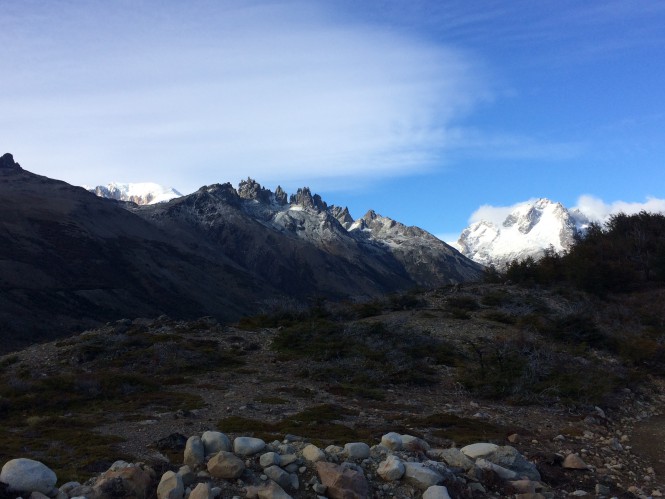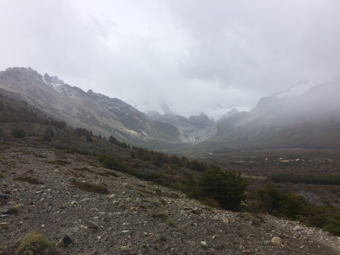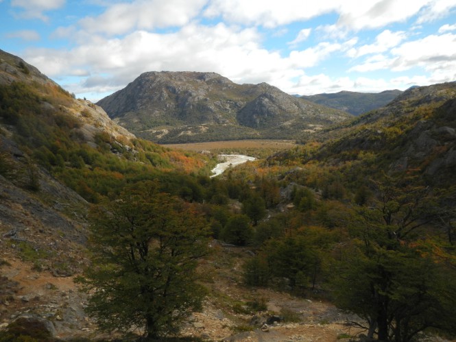A vista para o fundo do vale, direção S-SW, é linda, o Cordón San Lorenzo com a torre de Feruglio e uma série de glaciares que alimenta a laguna del Tranquilo, que dá origem ao rio de mesmo nome (mas não achei o rio assim tranquilo não).