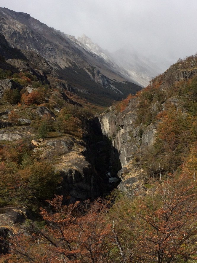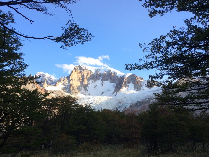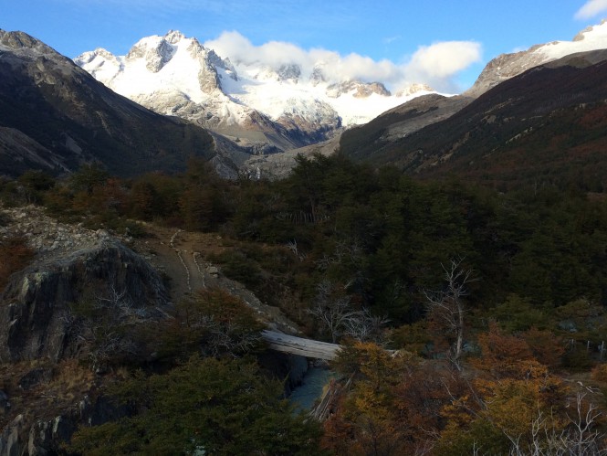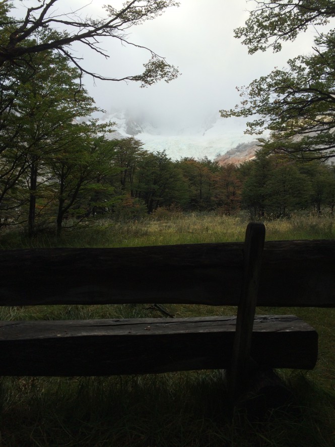 Entrei num maravilhoso bosque de lengas, O vale é de uma lindeza só. O San Lorenzo ainda está escondido atrás de uma curva. Mas adiante ele aparece majestoso. Com 3 horas cheguei no refúgio. Local excepcional, com linda vista do Cerro. Um banquinho de madeira permite lanchar com aquele vistão.