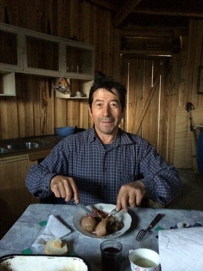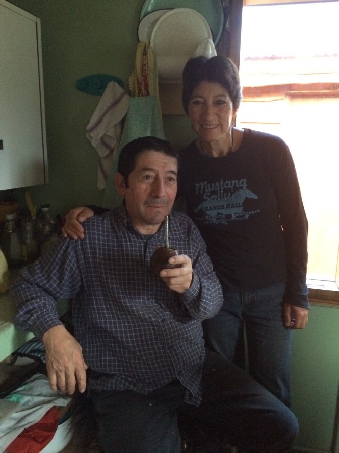 O Elia estava sentado num banco tomando chimarrão e me ofereceu o té de mate. O pessoal desta região (Cochrane e adjacências) é conhecido como os gaúchos chilenos. Eles imigraram do outro lado dos Andes, onde hoje é território argentino quando, por acordo, aquela parte chilena foi cedida a Argentina (boa parte do sul da Argentina era do Chile até o início do século XIX). Eles vieram com os costumes gaúchos. Há alguma diferença. O chimarrão é tomado numa cumbuca menor que a da Argentina/Uruguay e Brasil, a bomba também é menor e não usam água fervendo. O modo de vestir e de ser é idêntico.