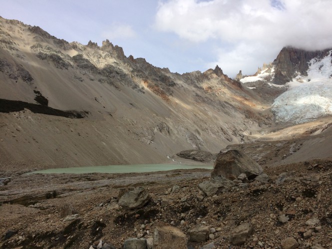 Fiz um passeio para a laguna do glaciar e fiquei pelo vale admirando a paisagem, tirando fotos. Mas não pude cruzar vários dos riachos que desciam das geleiras acima. Aquela hora da tarde, com o “calor” do dia já estavam com uma vazão grande.