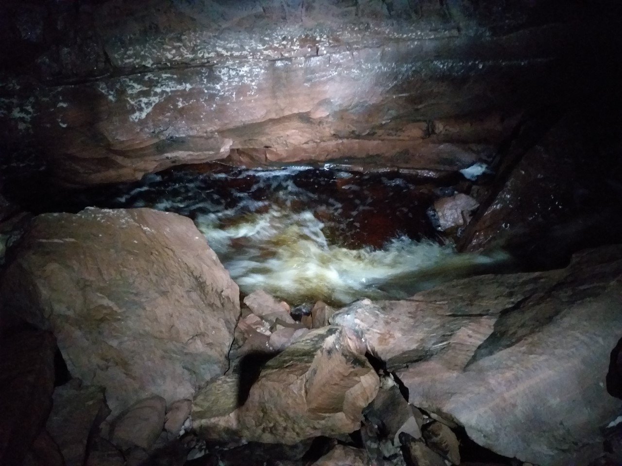 Entramos cerca de 400 a 500 metros na caverna, breu total, até um ponto que baixamos do salão principal para um lateral a esquerda onde avistamos um rio subterrâneo (o rio Lapão). Descemos até sua margem e observamos o sumidouro onde a água desaparecia.