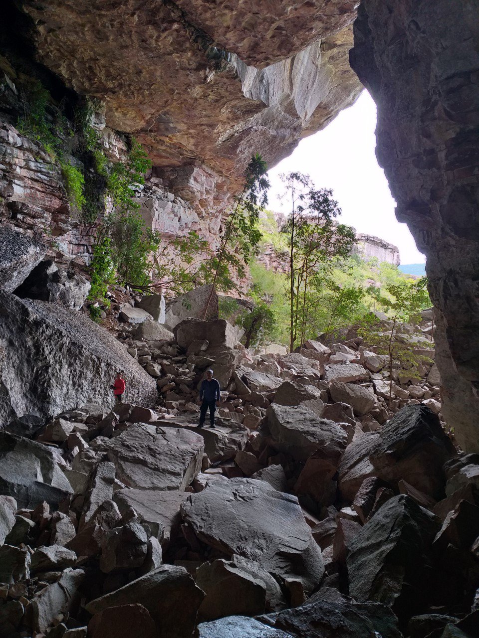 Chegamos na boca da gruta (55 metros de altura) descendo por uma fenda. As grandes pedras indicam que é uma gruta formada por desmoronamento.