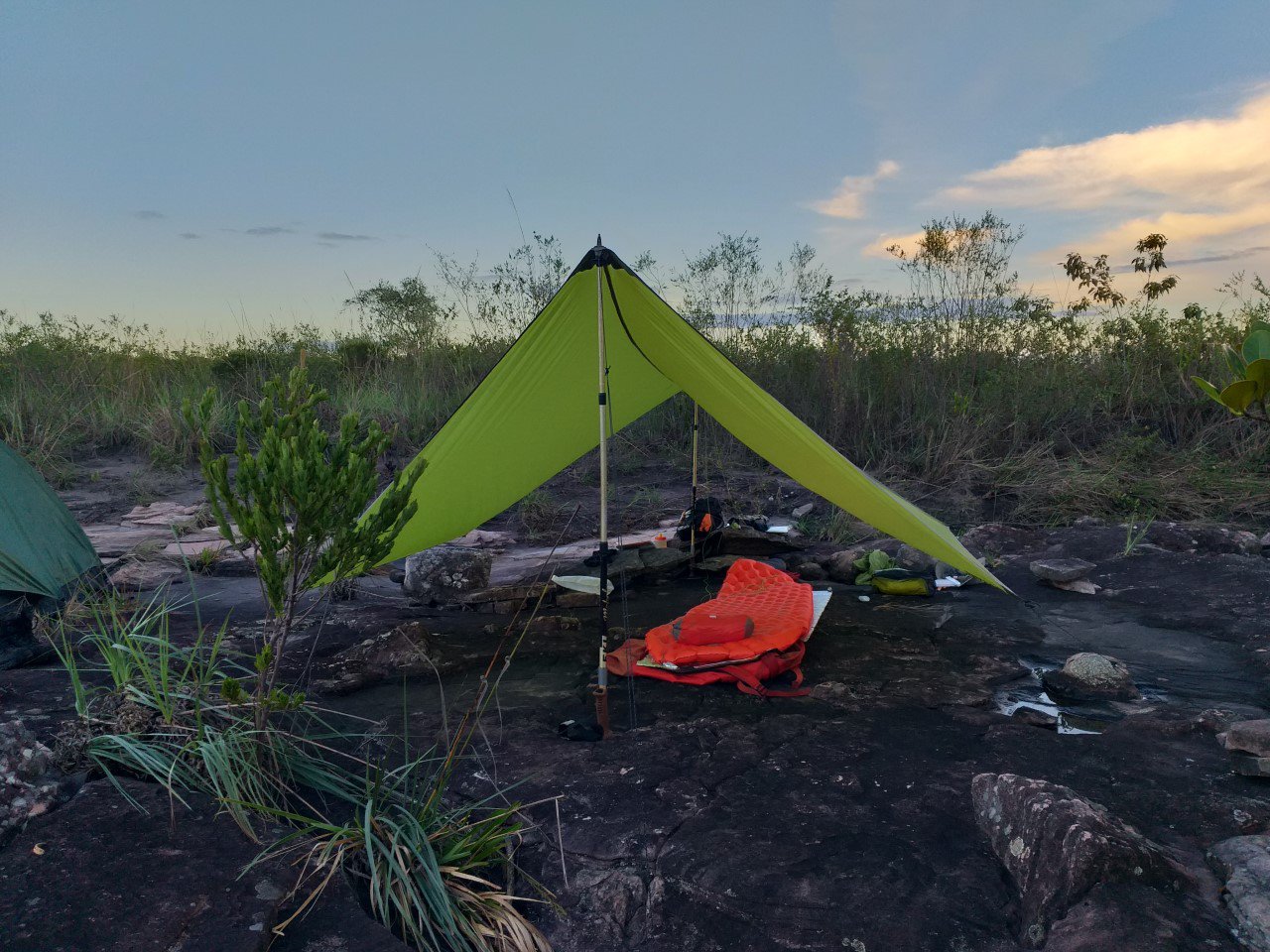 Meu bivaque com toldo. Mesmo em chão de laje é possível montar. Ouço tanta balela de "especialistas" de que na Chapada a tenda tem que ser auto-portante!