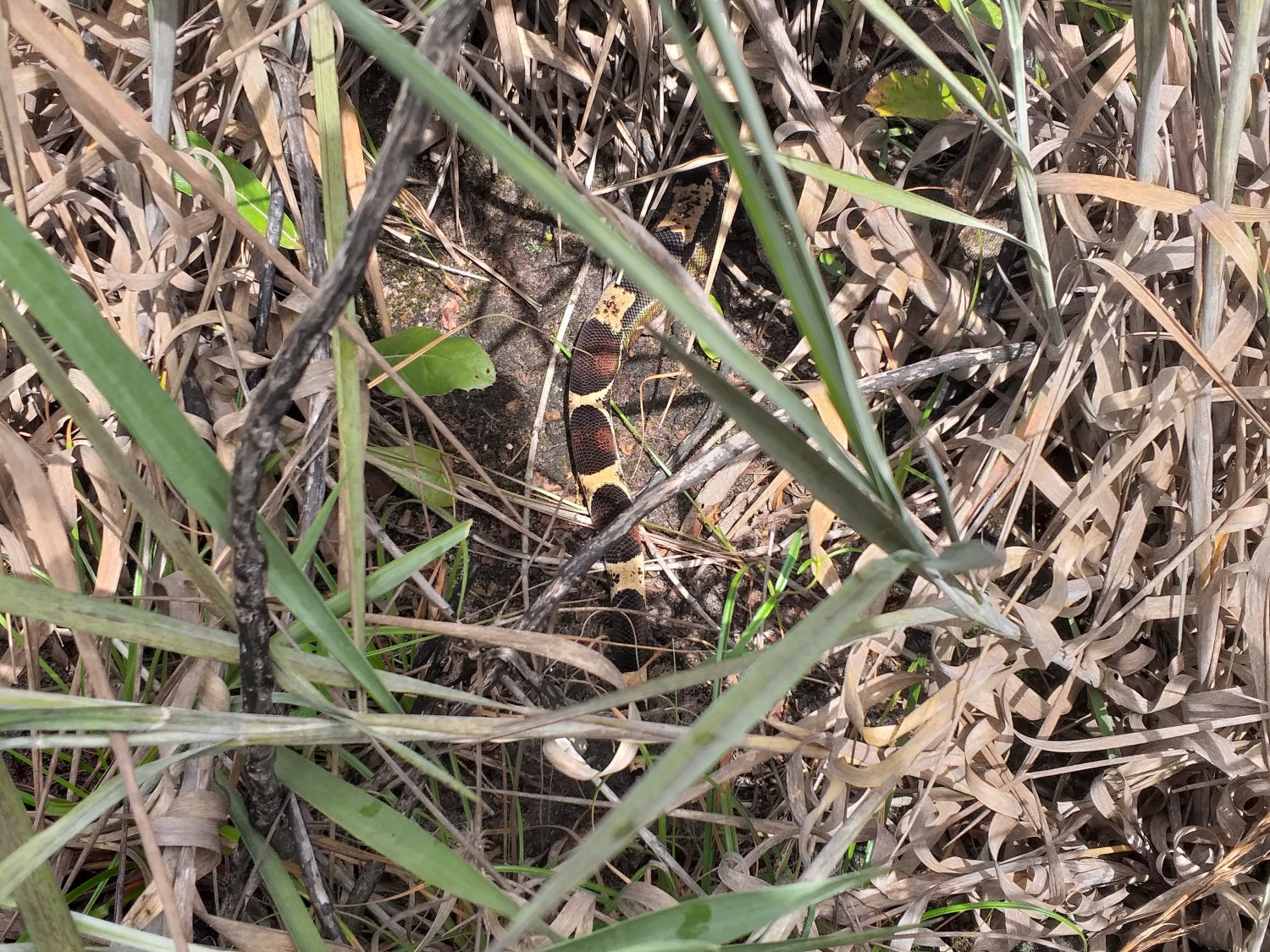 No caminho quase piso numa jibóia de metro e meio. Ela se encolheu debaixo de uma moita em posição defensiva. Tiramos fotos. Como o padrão de cores dela camufla bem em meio a folhagem!