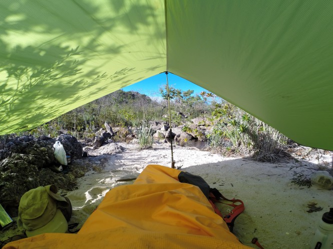 Apesar de ter armado a tarpa resolvi dormir bivacado em cima de uma laje, porque não havia nuvens no céu e a previsão não era de chuva. Muito legal dormir debaixo de uma lua quase cheia. O único problema é que esfriou bem durante a noite, pelo efeito do vento. Águas Claras é um lugar conhecido pelos ventos fortes. Já houve ocasião em que o vento destroçou barracas ali.