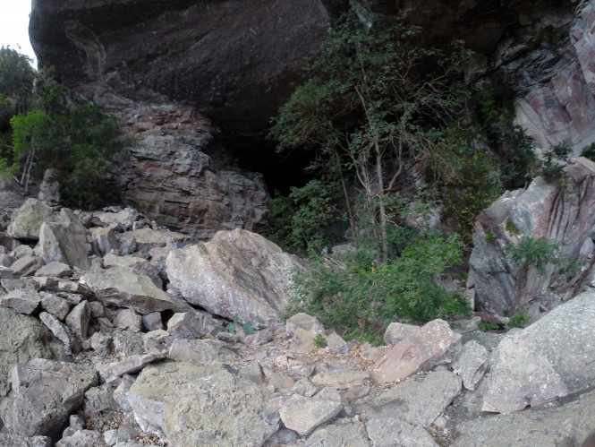 A gruta é impressionante. De arenito, deve ter na boca algo como 50 metros de altura ou mais. Adentrei por um chão coalhado de grandes pedras, até onde chegava a luz. Avancei um pouco no escuro mas estava só com uma lanterna de cabeça e não quis arriscar muito. Se a lanterna pifasse estaria lascado.