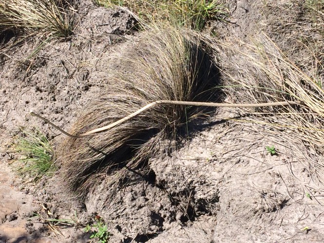 Desci e fui para Águas Claras, bonito local de acampamento. Ao chegar, procurando gravetos, topei com uma cobra espada. Uma amiga, bióloga especialista em serpentes, me disse que ela é agressiva mas tem veneno pouco potente. Ela mesmo já tomou umas picadas, mas ainda assim considera a cobra "uma fofa"!:-O