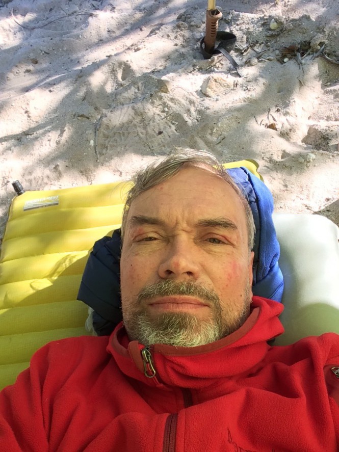 Tive então que botar todos os agasalhos para adormecer. Não levei saco de dormir, só o saco de bivaque e um liner. Estava sozinho.