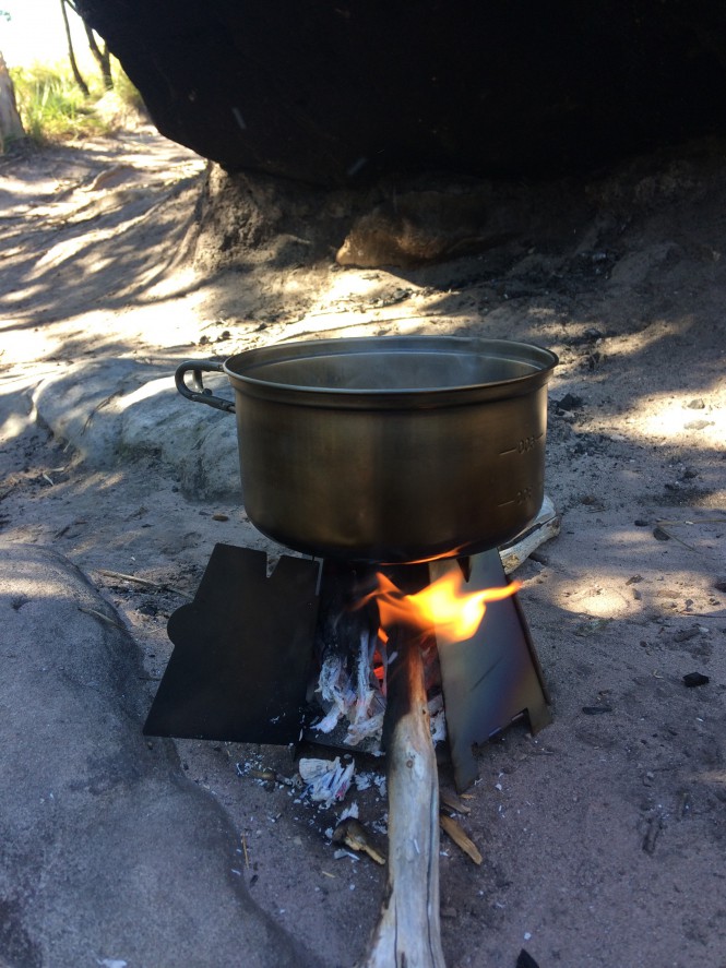 Usei o fogareiro a álcool para fazer café. É mais rápido que o fogareiro de gravetos. Levo sempre os dois porque se chover é alternativa já que é difícil e demorado fazer fogo com gravetos molhados.