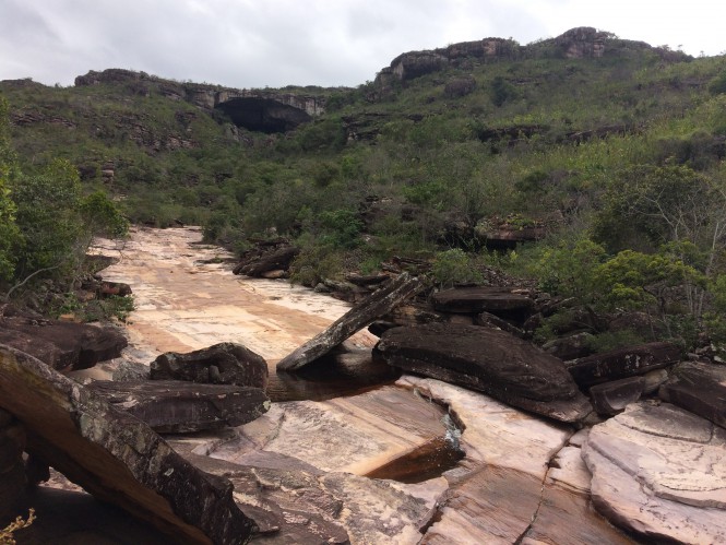 Esta trilha cai no rio Lapão (o mesmo no qual acampei mais acima na noite anterior) onde tive que andar pelo leito pedregoso do rio. No trecho final, antes de subir até a enorme toca do Lapão, devemos escalar uma pedreira difícil, com escalaminhada, devido as enormes rochas que um dia estiveram no interior da gruta. Levei pelo menos meia hora para superar os 50 metros finais.