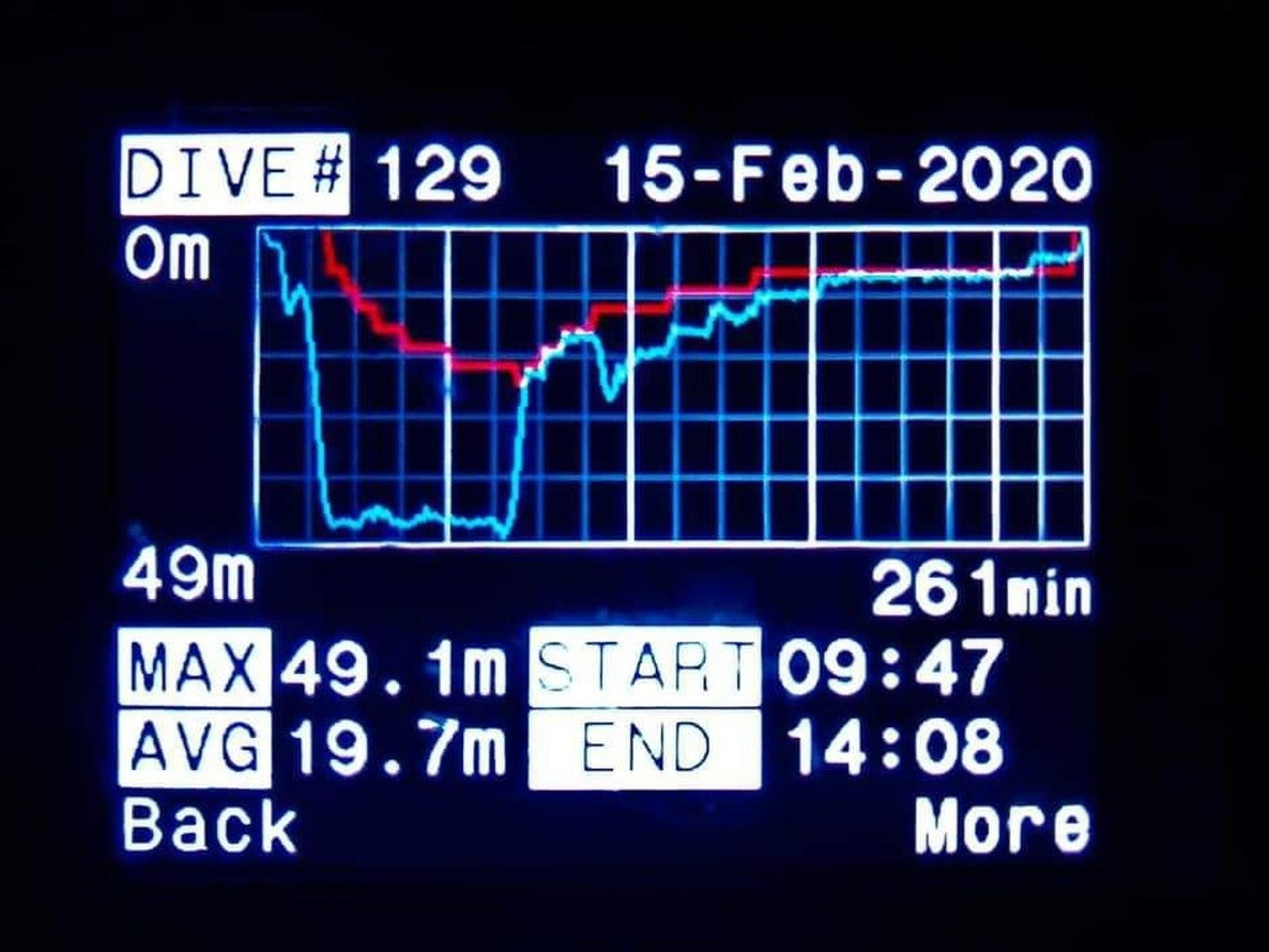 A bordo László comentou que acredita que nesta faixa de profundidade, 45 metros, o algoritmo do computador de descompressão (que calcula as paradas) deve ter algum problema. E a segunda vez que ele tem um início de DD. Para profundidades maiores não teve problemas.