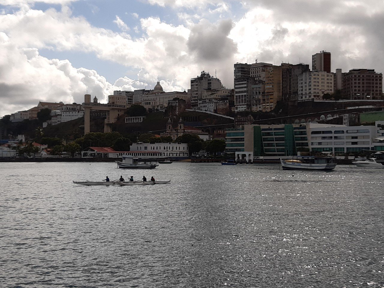 Saindo da marina. Elevador Lacerda ao fundo. Uma canoa havaiana em primeiro plano.