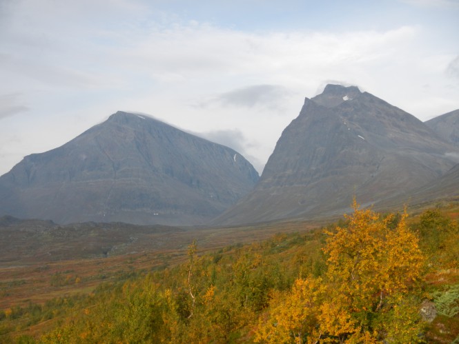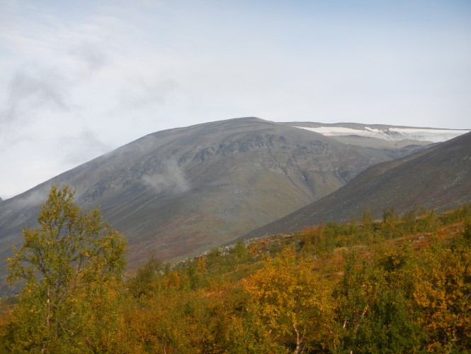 Atravessei uma ponte e mais adiante, olhando para trás, vi pela primeira vez o Kebnekaise até então oculto por uma outra montanha e pelas nuvens. Era muito alta. Com certeza seriam 12 horas de caminhada. Meu arrependimento passou. Seria muito cansativo subir e depois correr para Nikkaluokta no dia seguinte. Deveria ter um dia a mais.