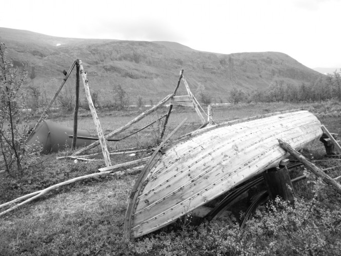 Acampei numa península do lago, nas ruínas do que parecia um antigo estaleiro de barcos de madeira. Um barco estava emborcado, suspenso do chão por travessas de madeira. A técnica de fabricação do casco com madeira parecia ter saído dos antigos drakkars vikings. Entrei debaixo dele e vi iniciais gravadas num banco, provavelmente as do construtor e o ano de 1965. Aquele barco tinha dois anos menos que eu.