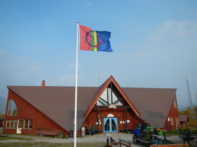 A bandeira Saami em frente ao restaurante em Nikkaluokta.