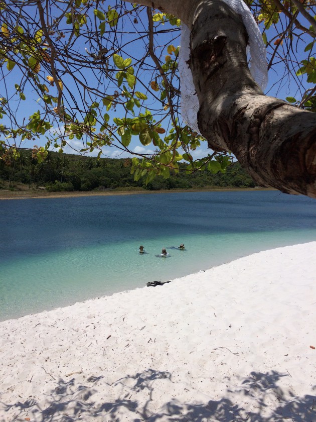 Não choveu durante a noite. Fui um dos primeiros a levantar e tirei fotos. A galera acordou aos poucos. Desfizemos o acampamento tomando o cuidado de não deixar rastros. Fomos todos para a lagoa. Eu, Paulo e Israel trouxemos máscara e snorkel porque Alberto havia sugerido. Fiquei besta com a lagoa: no máximo 5 metros de fundo, que é ocupado por algas verdes numa água cristal (daí provavelmente o nome Lagoa Verde). A duna formava uma ladeira submersa até o fundo de algas. Cardumes de peixinhos nadando de um lado para outro. Um dos lugares mais bonitos da Bahia!