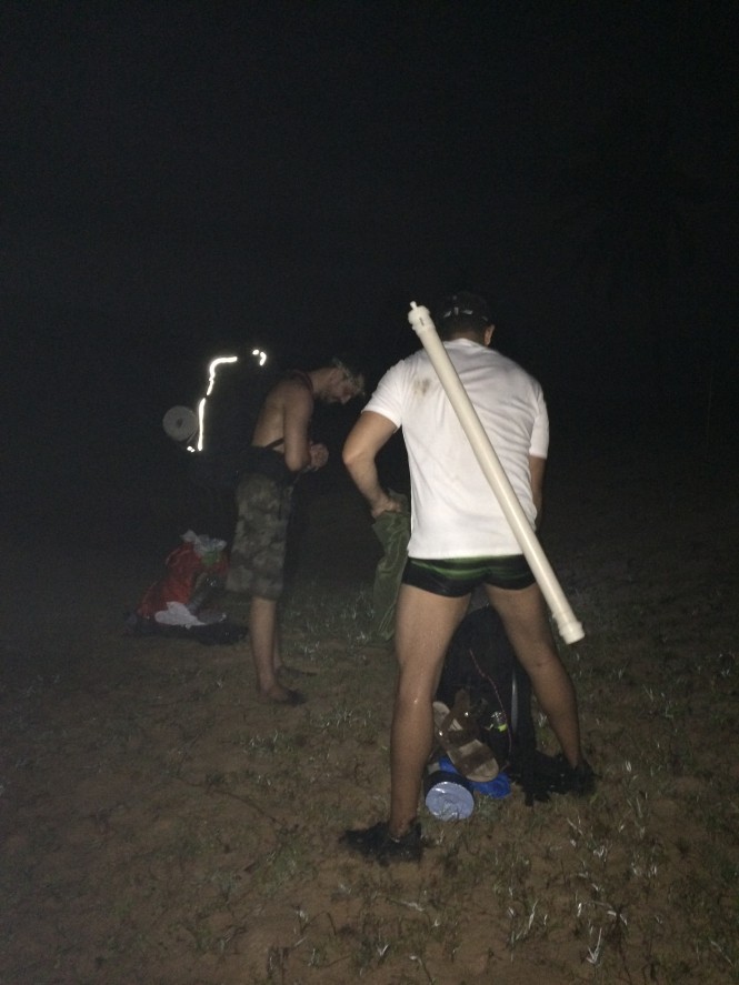 Aproveitamos umas estacas com bandeirolas que estavam fincadas em alguns pontos das dunas (parece que houve uma competição de quadriciclos no local e as bandeirolas marcavam o trajeto) para fazermos um abrigo com as lonas que havíamos trazido. Poderia chover durante a noite. O céu começava a ficar nublado. Lucas parecia um tatu cavando sem parar uma cova na areia, com uma lona cobrindo, onde dormiria. Israel também fez o seu próprio abrigo. Os demais ficaram debaixo do abrigo coletivo. Eu preferi dormir sozinho dentro do meu saco de bivaque.